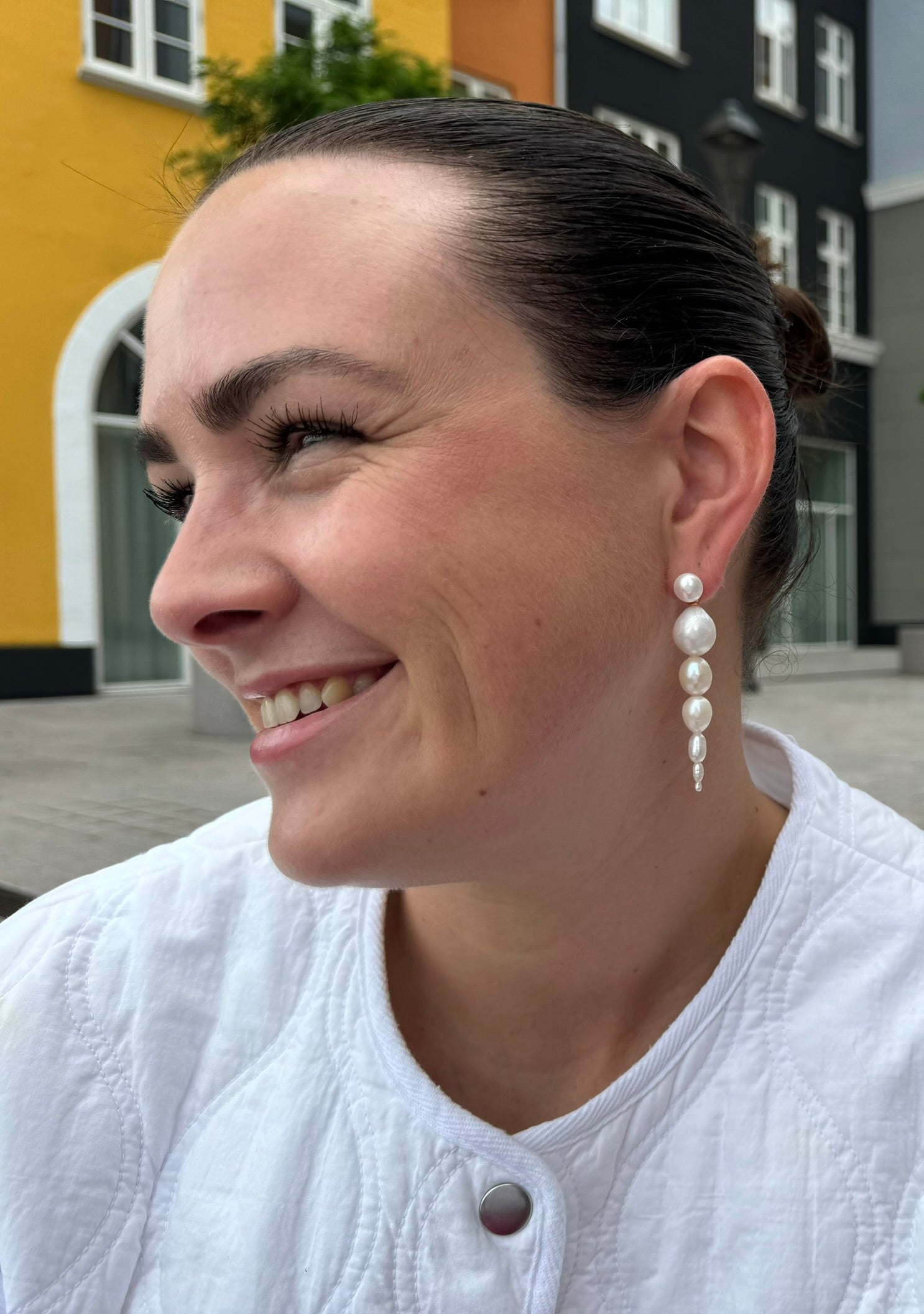 Mine absolut allermest solgte øreringe. På ørekrogen er der påsat en 9 mm. anboret ferskvandsperle. Kegleformen består af seks aflange ferskvandsperler, som bliver mindre og mindre. Den første og største perle måler omkring 12 mm., og den nederste måler 2 mm.