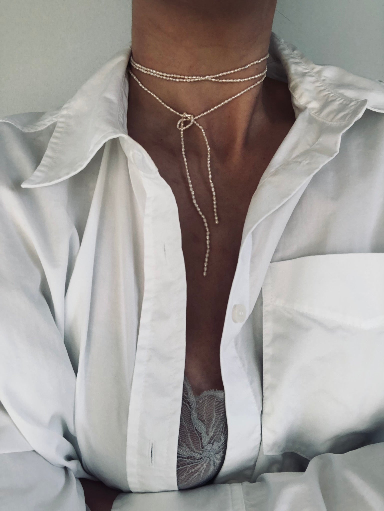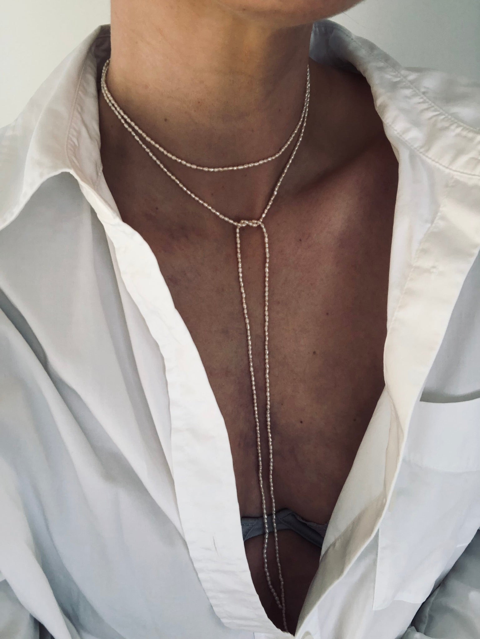 Det er en lang 'snor', som måler 120 cm, og så er en lukket i begge ender af en ferskvandsperle.