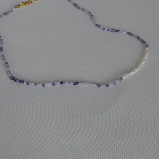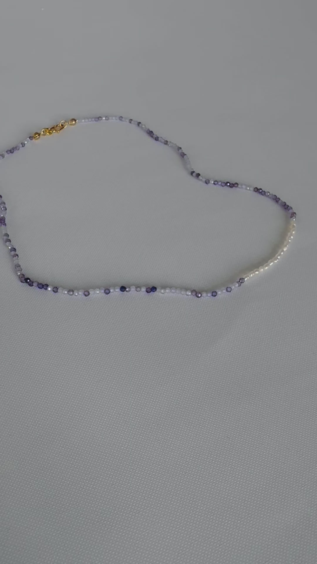 Afsindigt smuk perlehalskæde, som består af de smukkeste lilla natursten sat sammen med cirka 5 cm. med miniferskvandsperler.