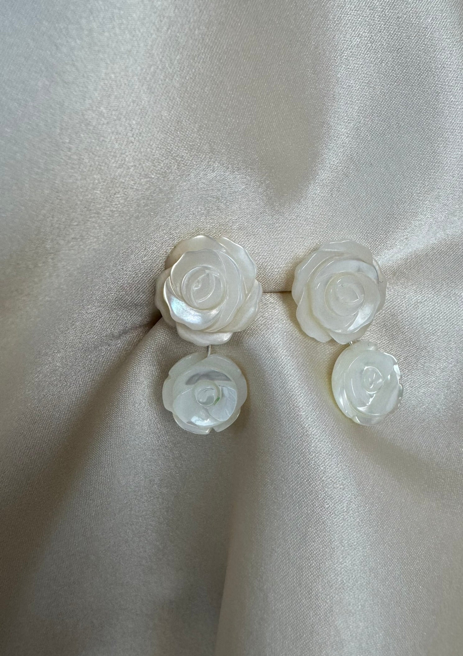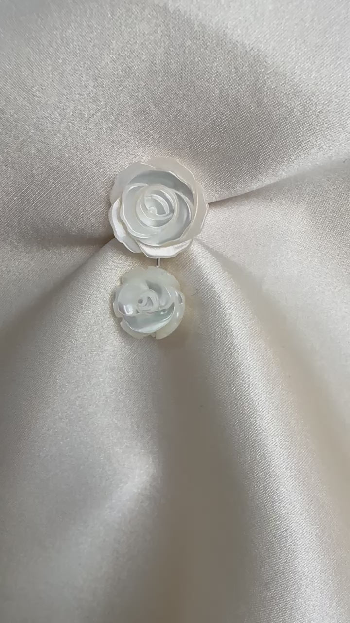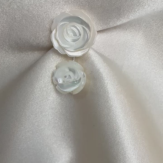 Roserne, som er udskårne af muslingeskallen, som ferskvandsperlerne har ligget i, måler 15 mm og hele øreringen måler 3 cm. Under rosen har jeg påsat endnu en fin lille rose, som måler 12 mm. Metallerne er 925 Sterling sølv. Prisen er for et sæt.